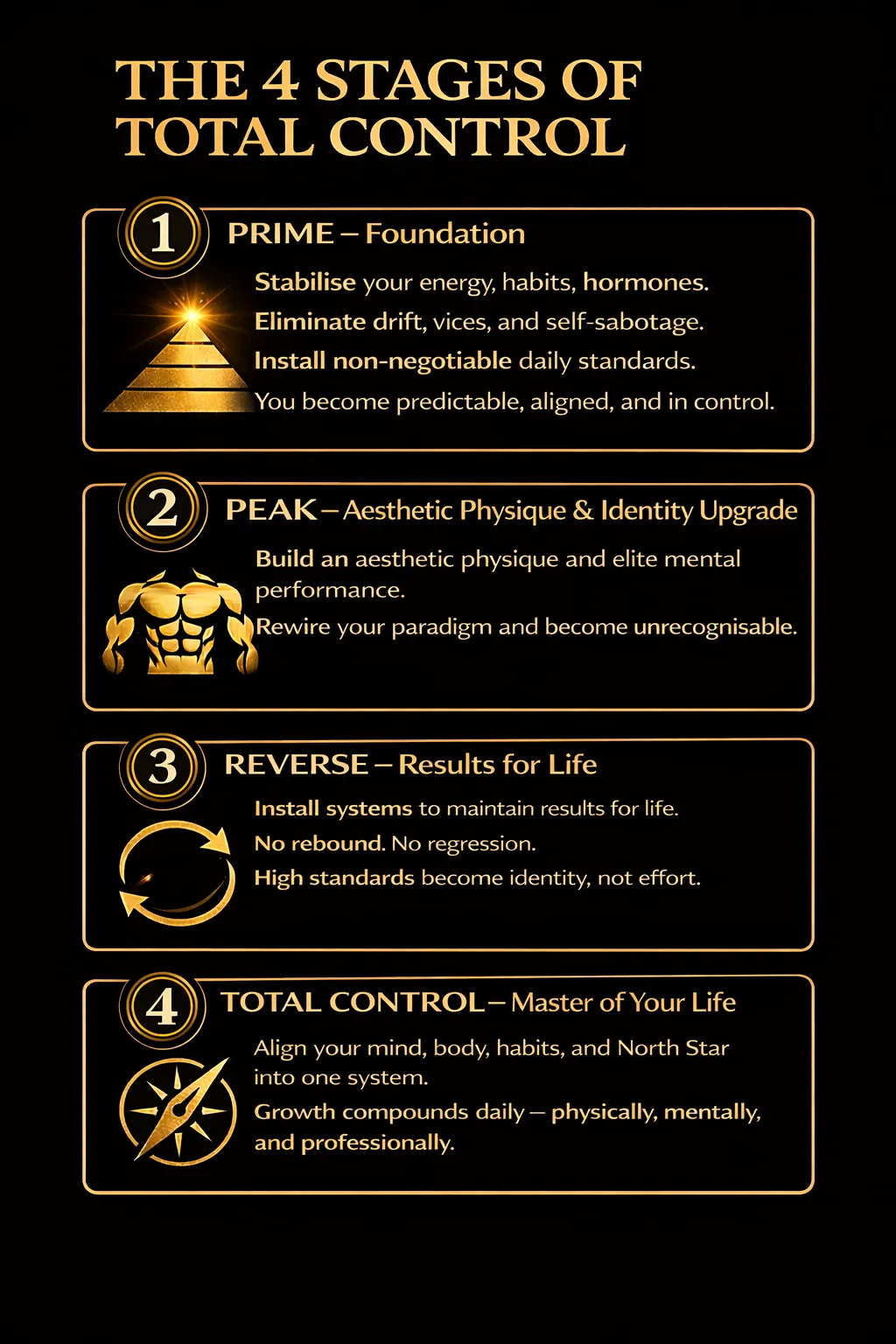 Build the physique, mindset, and identity required for Total Control.